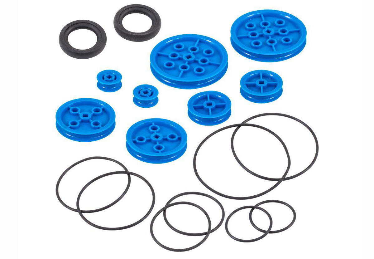 滑轮底座包包含不同尺寸和各种橡胶带大小的滑轮,并包含在所有 VEX IQ 入门套件和超级套件中。