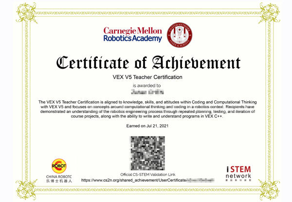 通过认证考试的学员,将获得美国卡耐基梅隆大学机器人学院的官方认证证书,这份证书不仅代表着对国际顶尖编程内容的掌握,同时证明了学员拥有STEAM教育的学习背景。